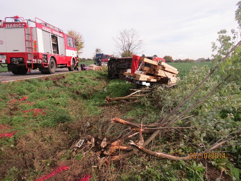 BARTOUŠOV – V pondělí 20. října dopoledne jel ve směru od Kopidlna na Jičín pětadvacetiletý řidič autem Ford Tranzit s přívěsem, na kterém měl naložené dřevěné trámy. Za Bartoušovem se zřejmě vlivem nepřiměřené rychlosti jízdy a nesprávně naloženého nákladu souprava rozvlnila a stala se tak neovladatelnou. Řidič poté vyjel vpravo mimo komunikaci, kde se převrátil na pravý bok. Při nehodě došlo ke zranění spolujezdkyně, která byla letecky transportována do Fakultní nemocnice v Hradci Králové. Alkohol u řidiče vyloučila dechová zkouška, celková škoda byla vyčíslena na 200 tisíc korun.