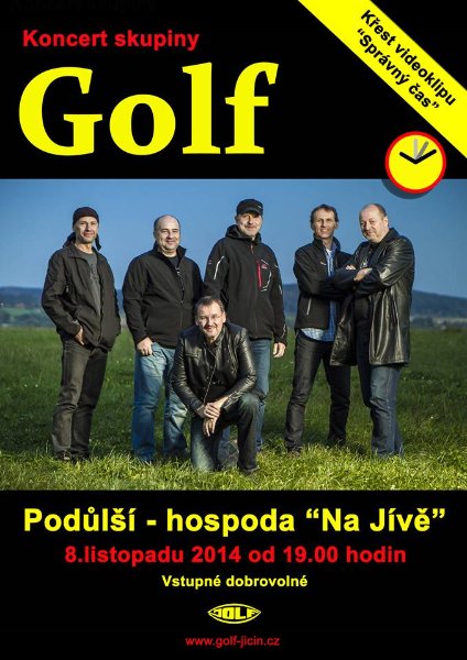 JIČÍN/ Podůlší – Dovolte mi, abych vás všechny pozval na další koncert kapely GOLF, který se uskuteční 8. listopadu od 19.00 hodin v hospodě „Na Jívě“ v Podůlší u Jičína. Čeká na vás křest našeho videoklipu „Správný čas“, naše nové DVD a CD a další nové skladby v našem programu. Více na www.golf-jicin.cz