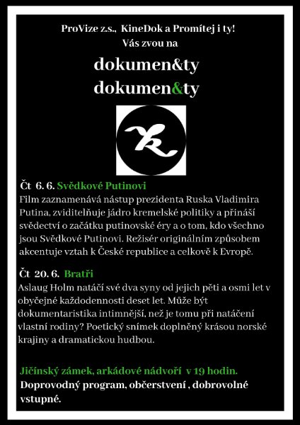 JIČÍN – ProVize, KineDok a Promítej i ty! zvou na další projekci dokumentárních filmů z cyklu dokumen&ty. Koná se ve čtvrtek 6, června od 19 hodin ve výukové místnosti na arkádovém nádvoří Valdštejnského zámku v Jičíně, promítat se bude film Svědkové Putinovi. Zaznamenává nástup prezidenta Ruska Vladimira Putina, zviditelňuje jádro kremelské politiky a přináší svědectví o začátku putinovské éry a o tom, kdo všechno jsou Svědkové Putinovi. Režisér originálním způsobem akcentuje vztah k České republice a celkově k Evropě. Po filmu budete mít unikátní možnost diskutovat s Maxem Tuulou, estonským producentem snažícím se přemostit ruský a evropský dokumentární film.