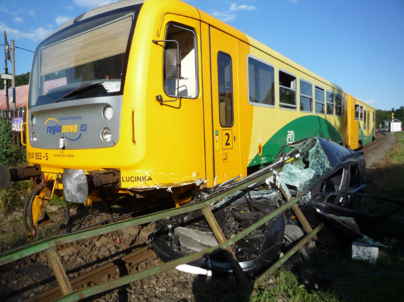 SEDMIHORKY – Tři jednotky hasičů zasahovaly v pondělí 4. července u dopravní nehody, při které se střetlo osobní auto s vlakem. Událost byla hasičům ohlášena v 18:18 hodin a na místě pomáhali profesionální hasiči z Turnova, turnovští dobrovolní hasiči a drážní hasiči z Liberce. Ke střetu došlo na přejezdu v těsné blízkosti vlakové zastávky Karlovice-Sedmihorky. Než vlak úplně zastavil, tlačil před sebou vůz zhruba 80 metrů. Původně měli hasiči informaci, že jsou uvnitř auta zaklíněné dvě osoby, v době jejich příjezdu již byla řidička i spolujezdec venku. Hasiči pomohli s transportem zraněných do vrtulníku a sanitního vozu. Hasiči provedli protipožární opatření a unikající naftu z osobního vozu jímali do úkapové nádoby. Trať byla v obou směrech uzavřena na více než 2 hodiny.