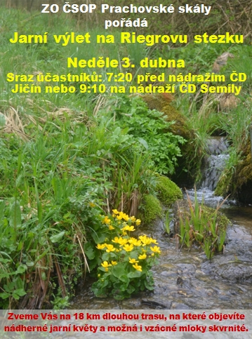 vylet_0 ČESKÝ RÁJ –  Další jarní výlet s ochránci přírody se uskuteční v neděli 3. dubna. Tentokrát se vydáte do severní části Českého ráje -na Riegrovu stezku v údolí Jizery. Budete-li mít čas a chuť, rozhodně přijďte v 7:20 hodin  na vlakové nádraží v Jičíně nebo v 9:10 hodin na nádraží Českých drah v Semilech. Můžete se těšit na 18 km dlouhý výlet  s mnoha pěknými výhledy a řadou nádherných jarních květů. Na setkání se těší členové ZO ČSOP Prachovské skály.