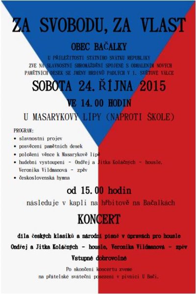BAČALKY – Dvojobec Bačalky – Lično na rozhraní Středočeského a Královéhradeckého kraje připravila na 24. října pietní vzpomínkový akt k výročí vzniku Republiky a 100. výročí Velké války. Začátek je ve 14.00 hodin u Masarykovy lípy u školy, kde obec připravila i posvěcení nově umístěných desek se jmény padlých hrdinů. V 15.00 hodin v kapli na hřbitově na Bačalkách začne koncert pěvkyně Veroniky Vildmanové, na housle ji doprovodí manželé Koláční z Jičína. Od 16.00 hodin program uzavře přátelské posezení v pivnici U Bači.