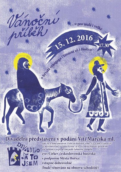 HOŘICE – Divadelní představení „Vánoční příběh“ v podání Víti Marčíka mladšího se uskuteční ve čtvrtek 15. prosince od půl šesté vpodvečer v bývalé synagoze v Hořicích. Je to víceméně tradiční zpracování betlémské události a to především podle Lukášova evangelia. „Omlouváme se, že v našem kuse nevystupuje ani děda Mráz ani Santa Claus a už vůbec ne stádo sobů. Tito tak oblíbení návštěvníci oken, balkónů a teras se nám nevešli do představ o Vánocích, které se přece kvůli nim neslaví. Máme tam zato místo pro Tři krále, pastýře, anděly, Alžbětu a Zachariáše, a konečně Marii, Josefa a Ježíška, kterému během celého představení hrajeme a zpíváme všemožné koledy místy námi upravené,“ dodává hlavní aktér V. Marčík mladší. Vstupné je dobrovolné a bude věnováno na obnovu schodiště v synagoze. Zvány jsou všechny věkové generace. Pořadatelem je Církev československá husitská s podporou Města Hořice.