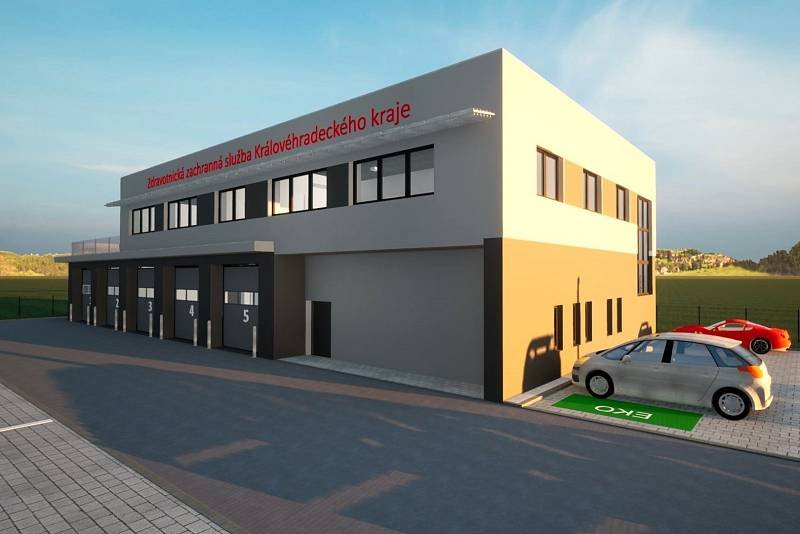 Postupně roste dvoupodlažní nepodsklepená budova obdélníkového půdorysu se zatravněnou střechou a fotovoltaickými panely. V přízemí budou garážová stání sanitek, technologické, technické a skladovací místnosti, dekontaminační prostory a šatny personálu.