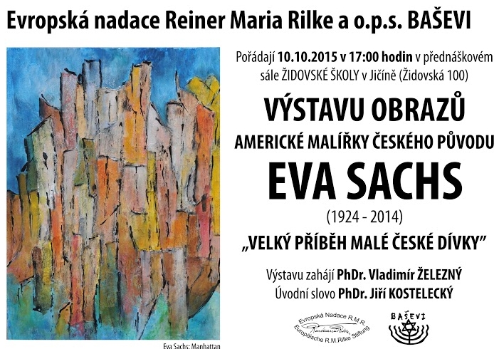 JIČÍN / Židovská 100 – Narozena 1924, zemřela vloni. Se silným životním příběhem a s tvorbou americké malířky českého původu, která jako mladá dívka prošla terezínským ghetem, aby z Československa odešla po únoru 1948 do USA, vás seznámí výstava v Jičíně. Představí Evu Sachs, jenž je také autorkou autentických dopisů židovské dívky deportované v roce 1941 z Brna do koncentračního tábora Terezín. Dostalo se jí té „pocty“, že byla v mládí vyškrtnuta ze seznamu smrti. Výstavu v Jičíně zaštiťuje Evropská nadace Reiner Maria Rilke a začíná 10. října od 17 hodin v přednáškovém sále bývalé židovské školy v Jičíně.