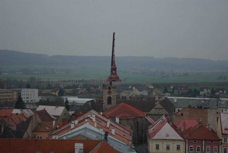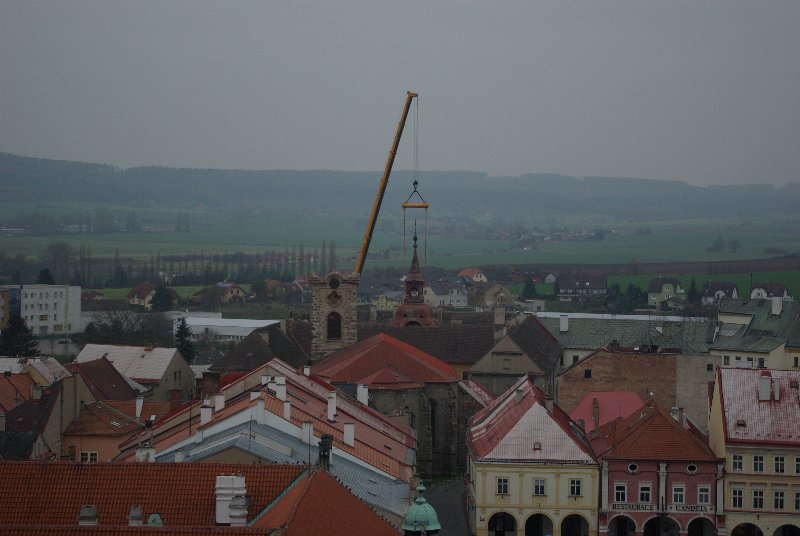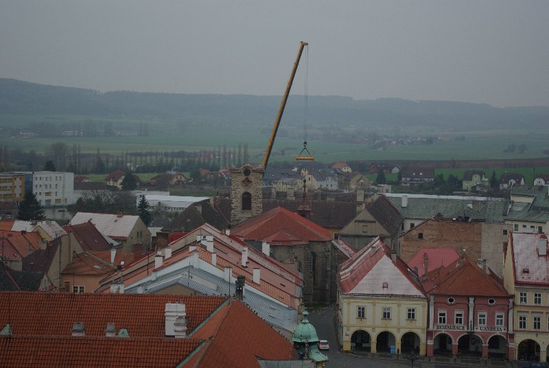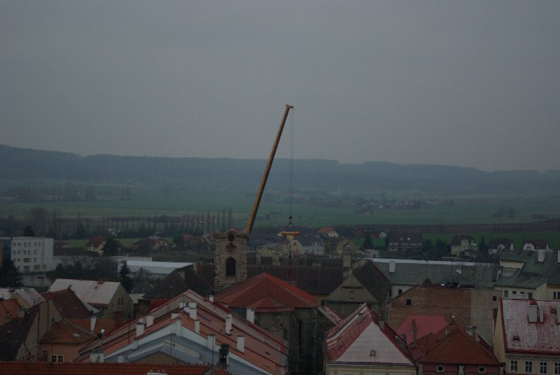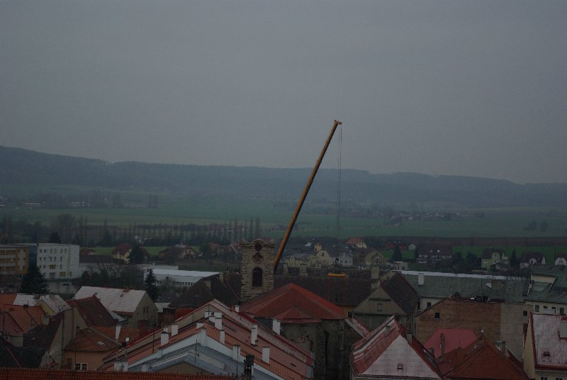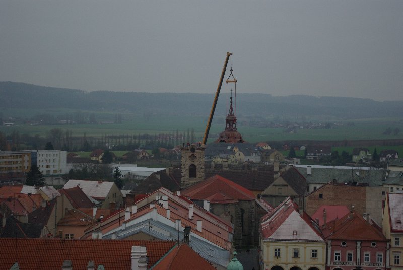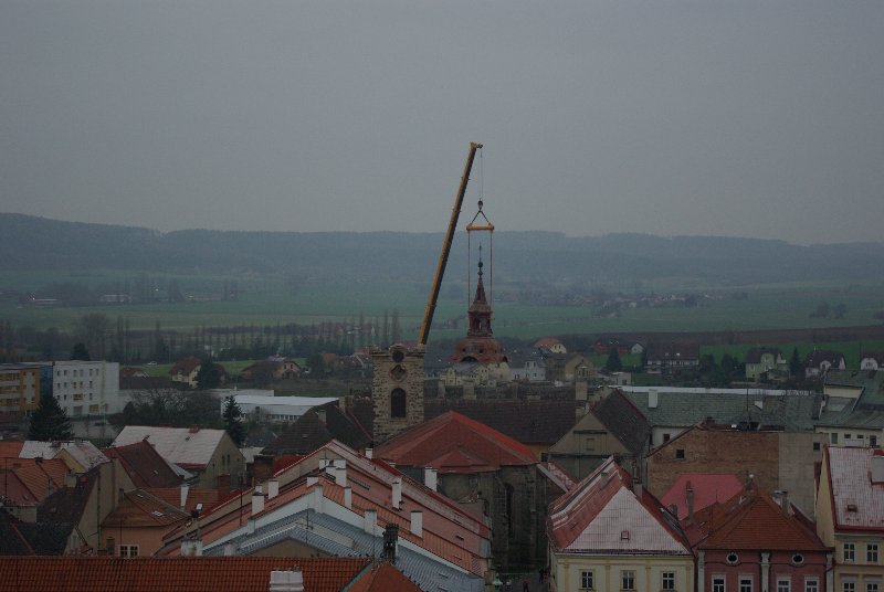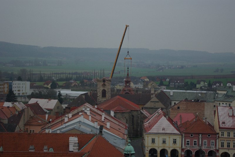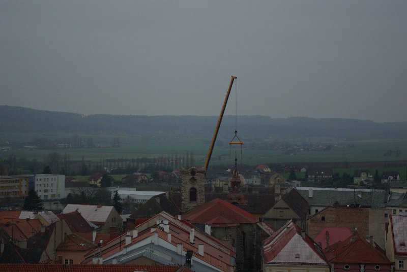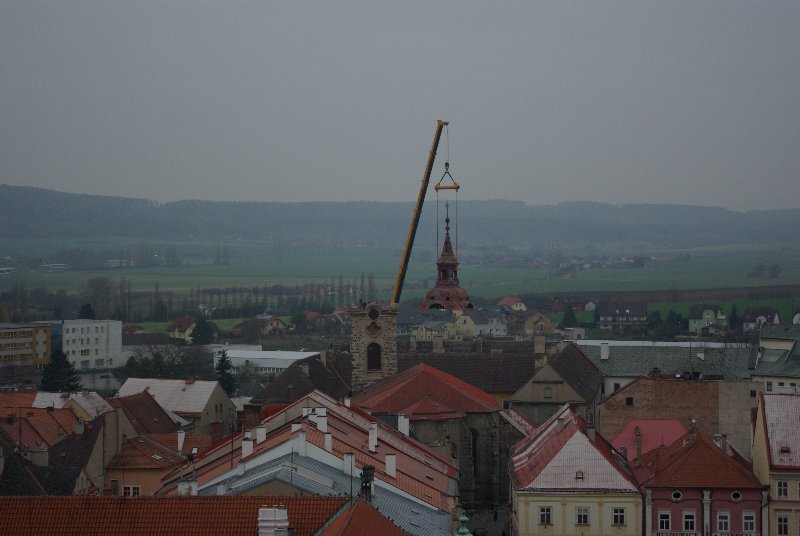 titl JIČÍN – V sobotu 29. listopadu se kostel sv. Ignáce v Jičíně konečně dočkal prvního rekonstrukčního kroku. Dodavatelská firma „nechala zmizet“ střechu věže. Připojujeme informaci z tiskové zprávy města, podle níž dojde ke snesení vrchní části věže kostela sv. Ignáce za pomoci jeřábu a ke snesení kopule. „Vše proběhne z nádvoří jezuitské koleje, kam také bude kopule snesena. S dopravním omezením se nepočítá, nebude však možné parkovat v bezprostřední blízkosti kostela. Průjezd náměstím Svobody by neměl být omezen,“ informovala před  zahájením akce mluvčí jičínské radnice Magda Doležalová.  Co pozoruhodnou jičínskou památku čeká, to se dozvíte i na tomto odkazu: http://zpravyceskyraj.cz/pomuze-mesto-zachranit-nejstarsi-pamatku/ „Odlet“ části věže můžete pozorovat ve fotogalerii.