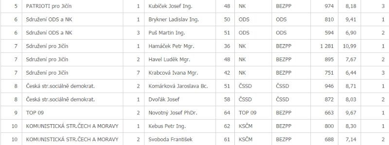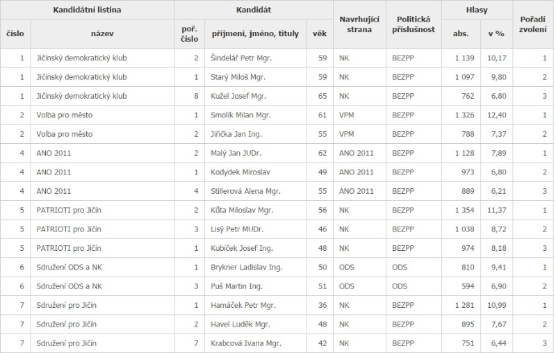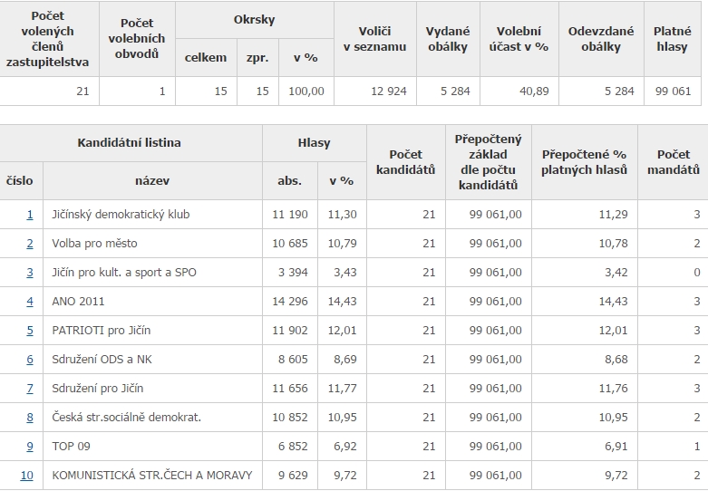 Kompletní výsledky najdete v galerii pod článkem. Vyplývá z nich, že volby se v Jičíně nevydařily straně TOP 09, která získala jeden mandát. Komunistům zůstávají i  nadále dva zastupitelé, seskupení Jičín pro kulturu a sport a SPO se do zastupitelstva nedostalo.