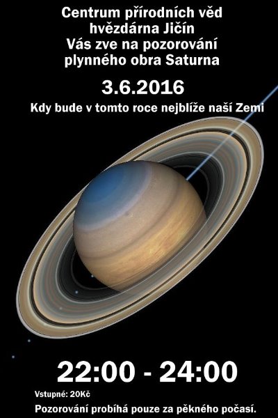 JIČÍN – Pohled z Centra přírodních věd – Hvězdárny Jičín do vesmírného okna si návštěvníci mohou užít v pátek 3. června od 22:00 do 24:00 hodin. Budou pozorovat planetu Saturn, která je letos v tento den nejblíže naší planetě.