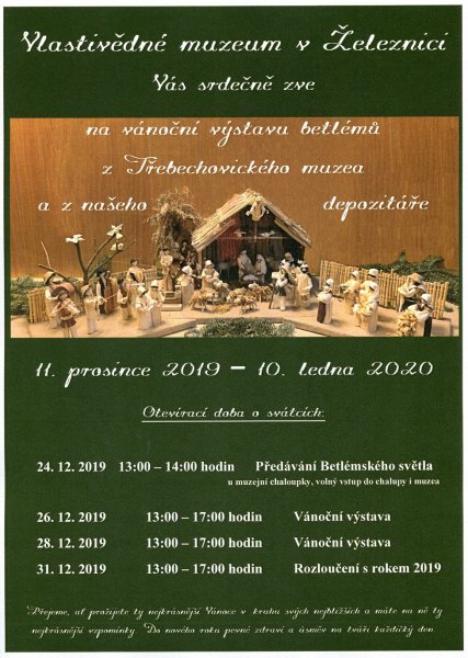Železnice – Muzejnice z Vlastivědného muzea v Železnici zvou od 11. prosince na Výstavu betlémů z Muzea betlémů v Třebechovicích pod Orebem a z depozitáře železnického muzea. 20. prosince od 18.00 hodin se uskuteční Adventní koncert Evy a Marka Ondráčkových a jejich hostů. 24. prosince od 13 do 14 hodin tam můžete přijít pro Betlémské světlo V té době bude otevřeno muzeum i roubená chaloupka s tradiční vánoční výzdobou. 26. a 28. prosince od 13 do 17 hodin na vás ve Vlastivědném muzeu čeká Vánoční výstava ve Vlastivědném muzeu. 31. prosince se od 17 hodin koná rozloučení s rokem 2019, kdy se většinou hraje na klavír, zpívají koledy, popíjejí horké nápoje a vyprávějí příběhy ze života.