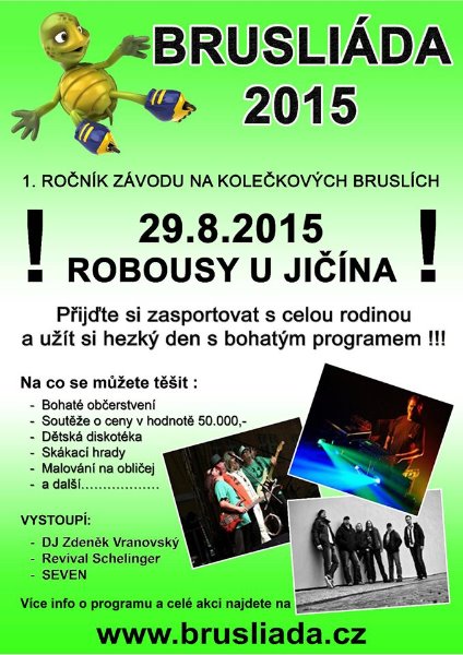 11896345_942102435849865_4759136684764147729_o ROBOUSY – Závody na kolečkových bruslích pro děti i dospělé se konají v Robousích u Jičína v sobotu  29. srpna od 9 hodin ráno.  Celodenní program je připravený pro všechny,večerní koncerty nabídnou  Revival Schelingr, Kapela Seven a after party až do rána! Silnice pro Brusliádu bude uzavřena na 24 hodin.